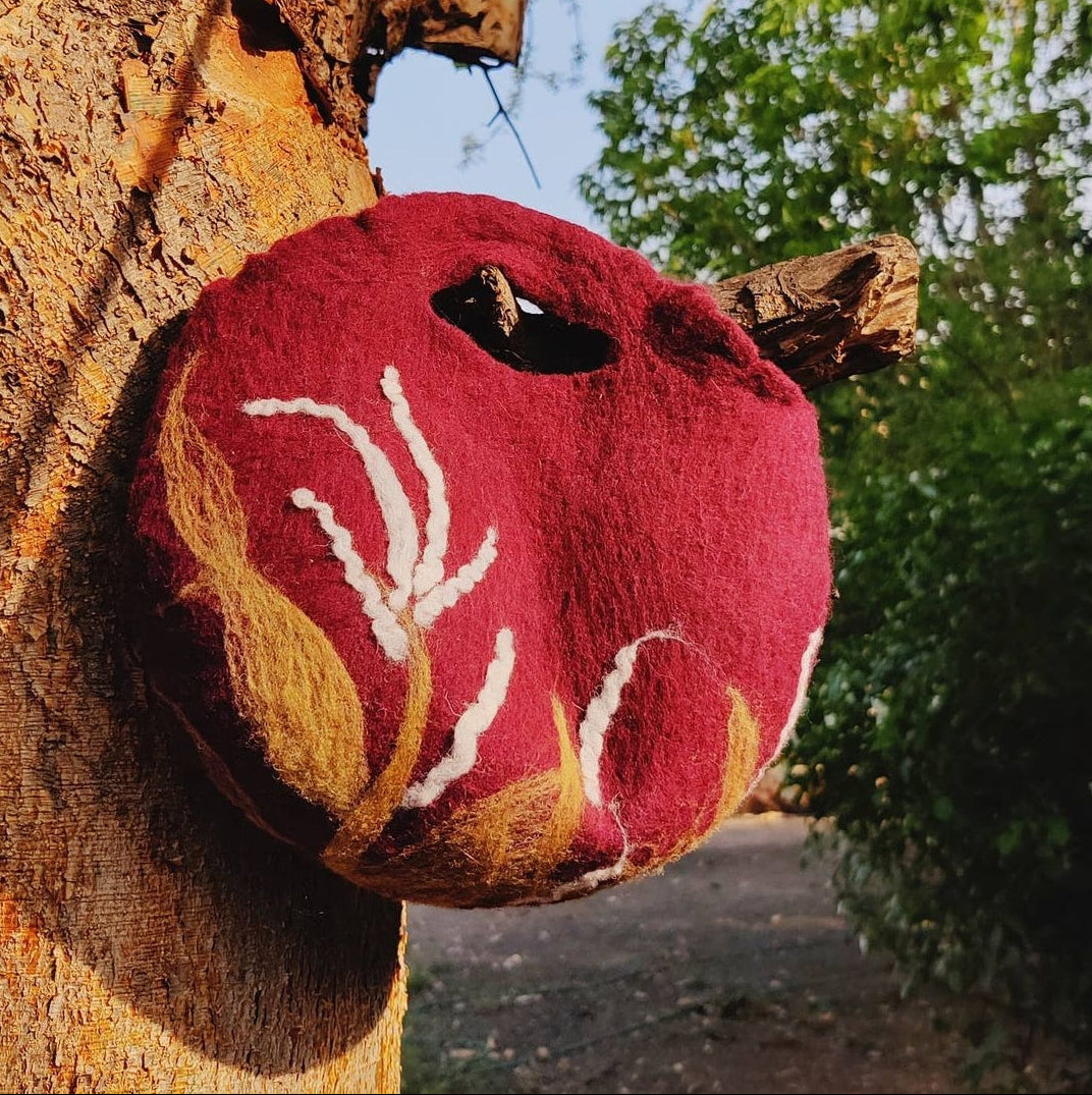 The deep crimson base carries hand-felted patterns inspired by wild blooms — crafted in earthy mustard and ivory wool — giving each bag a distinct identity. Naturally dyed and eco-consciously made, this one-of-a-kind piece embodies the philosophy of slow, mindful fashion.